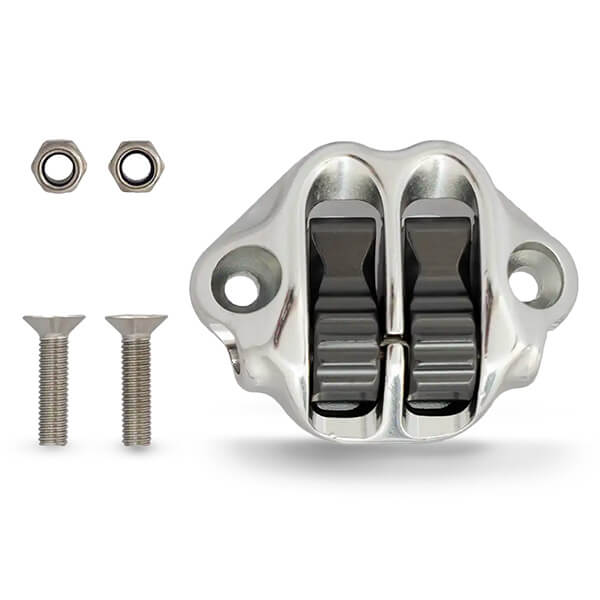 The DMM Kinisi Rope bridge adjuster, a user-friendly component of the DMM Kinisi Max harness, allows climbers to adjust their rope bridge length easily. While the Kinisi Max harness has one bridge adjuster as standard, some climbers may prefer one adjuster on each side. The sprung cleats on the adjuster ensure a secure grip on the rope (without damaging the rope), making the bridge easily adjustable with one hand. The Kinisi Rope Adjuster Kit includes two M5x20 bolts and two self-locking M5 nuts for easy installation - the unit is ambidextrous (you can install it on the right or left of the harness).