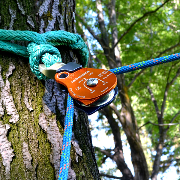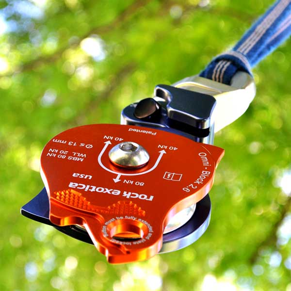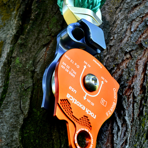 The Rock Exotica Omni-Block 2.6 Single is a high strength, 2.6" (66 mm) sheaved, swiveling rope block/pulley - ideal for tree rigging applications. The smooth, ball bearing action of the Rock Exotica Omni-Block eliminates twisting of the rope in rigging systems. This precision fabricated alloy block has a unique button-activated release feature that allows instant access to the sheave for mid-line attachment. The milled alloy attachment eye is large enough to accept most carabiners and snaps. Accepts rope up to 13 mm. Made in the USA.